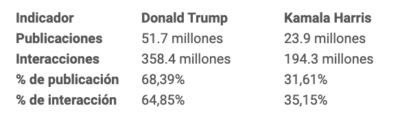 Donald Trump fue superior en la cantidad de publicaciones con 51.7 millones y Kamla harris con 23.9 millones. Hablamos que por cada publicación de Kamala se hacían dos de Trump, pero eso es sin mencionar las interacciones que el público tenia con las mismas, lo que indica que los twits en favor del candidato Trump tenían una amplificación algorítmica superior a los de Kamala, lo cual nos muestra que estamos ante un arma sumamente poderosa que puede cambiar percepciones a la ora de un ciudadano ir a votar por un candidato. Le dejamos a continuación una matriz que muestra estos valores: