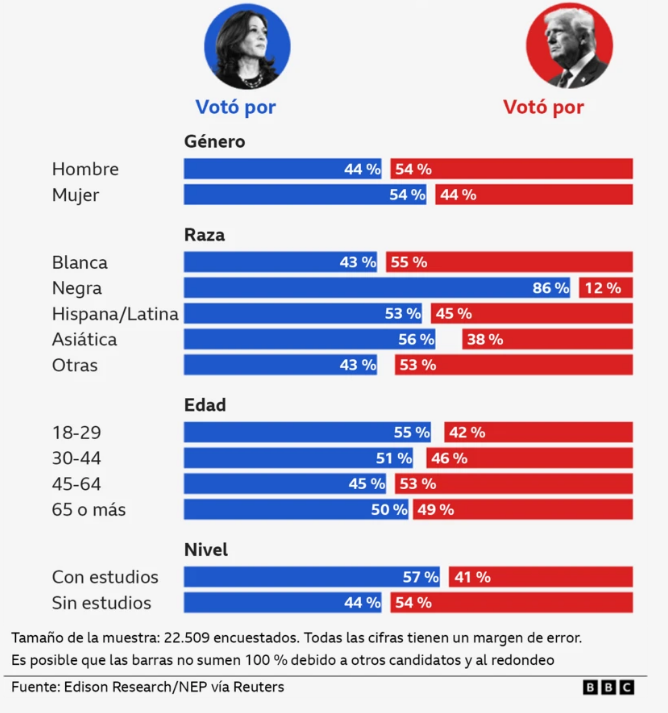 Otro elemento ha destacar a favor de Donald Trump es que, en la población masculina, los hispanos tomaron la decisión de votar por él de forma masiva, lo cual le dio el triunfo sobre Kamala Harris. Sí, la población masculina latina votó por Trump, independientemente del SESGO racial con el que estaba cargada la campaña de quien será el presidente No. 47 de EE.UU.