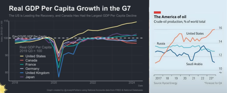Por último, en relación a los demócratas, es preciso destacar que en estos momentos Estados Unidos es líder mundial en la explotación de petróleo y gas, lo cual le genera grandes ingresos al gobierno y su PIB anda por las nubes tal como lo mostramos en los siguientes gráficos.
