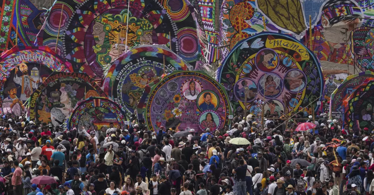 Un grupo de personas ayuda a elevar un papalote gigante que se desplegará el Día de Todos los Santos como parte de las celebraciones del Día de los Muertos en Sumpango, Guatemala, el viernes 1 de noviembre de 2024.