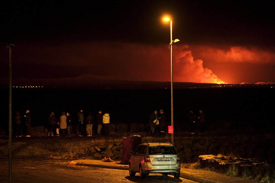 Un grupo de personas observan la erupción del volcán en la península de Reykjanes. EFE/EPA/ANTON BRINK